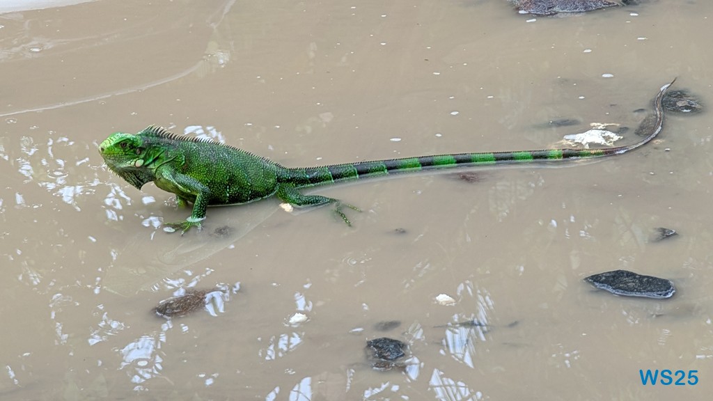 Wer sich am Strand denn noch langweilt, kann hier freilaufende Enten, Hühner und Hähne, und einen in einer Pfütze liegenden Leguan beobachten. Hin und wieder sollen auch Meeres-Schildkröten hier auftauchen, die sehen wir aber leider nicht.