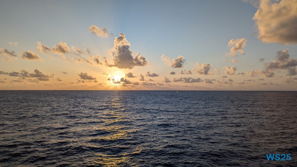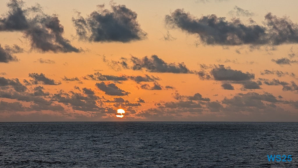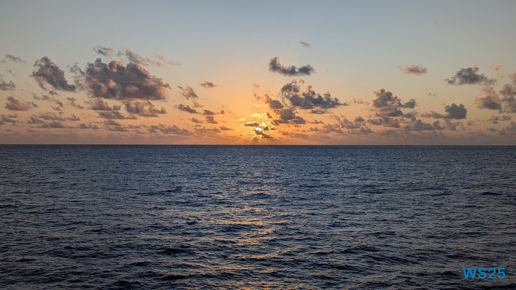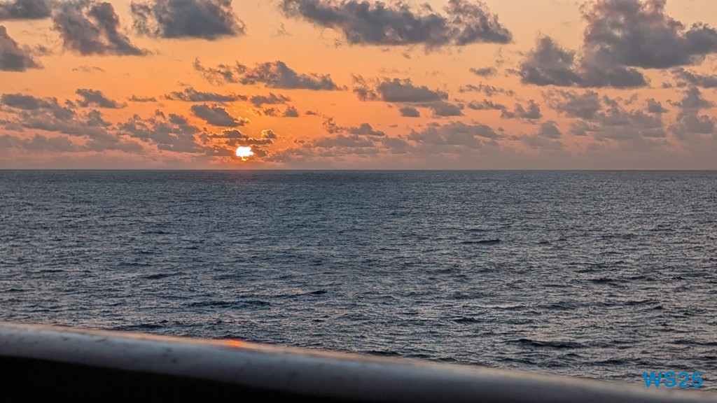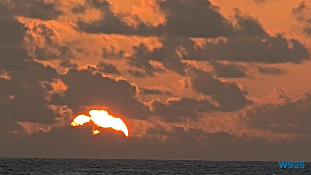 Um 18 Uhr geht die Sonne dann schon unter. Sonnenuntergänge auf dem Meer sind immer etwas ganz besonderes. Auch heute sehen wir einen roten Feuerball, der die wenigen umliegenden Wolken orange anleuchtet. Ein wunderschönes Bild.