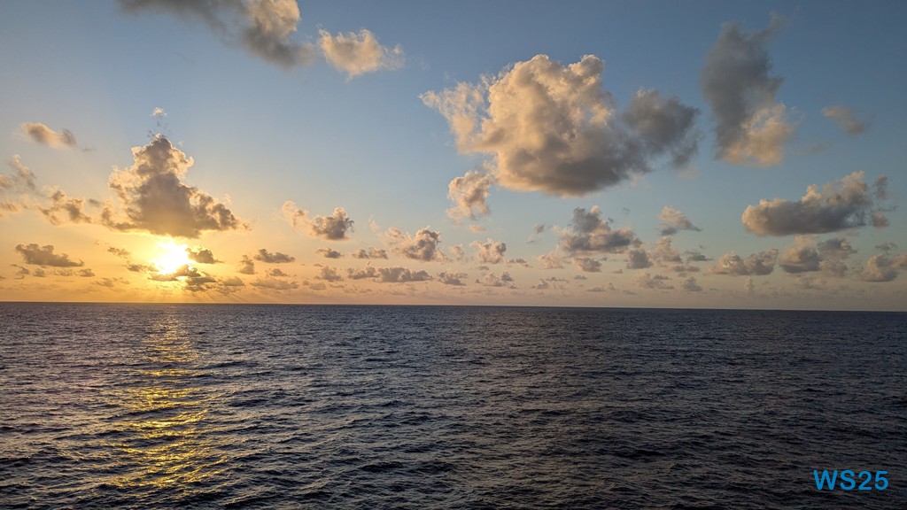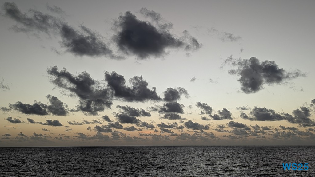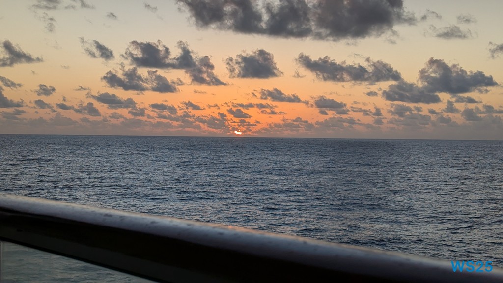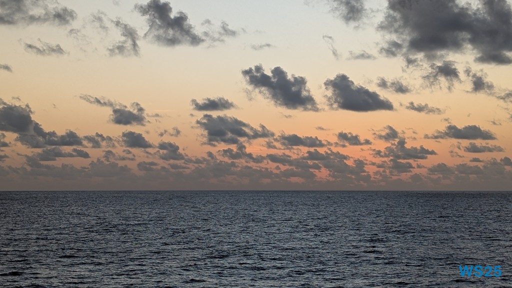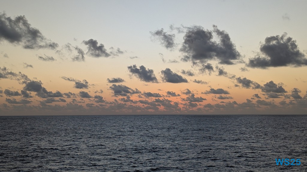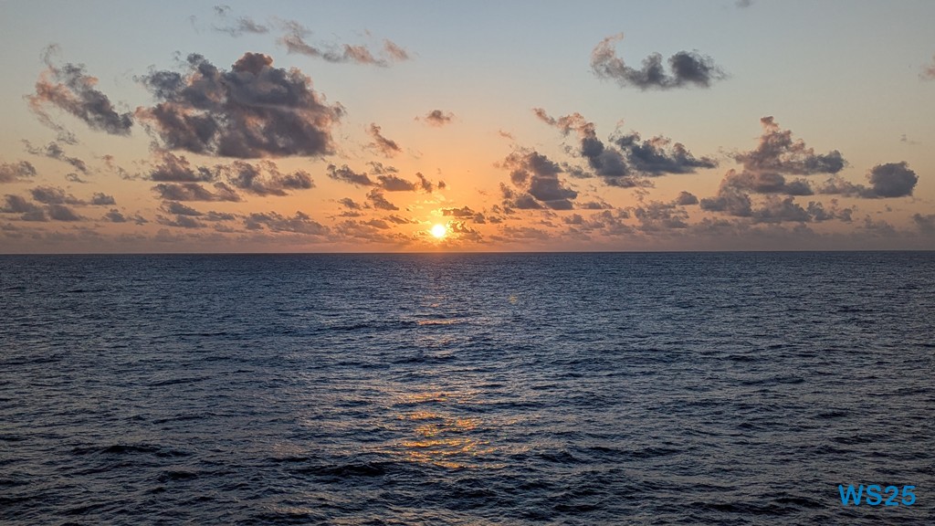 Um 18 Uhr geht die Sonne dann schon unter. Sonnenuntergänge auf dem Meer sind immer etwas ganz besonderes. Auch heute sehen wir einen roten Feuerball, der die wenigen umliegenden Wolken orange anleuchtet. Ein wunderschönes Bild.