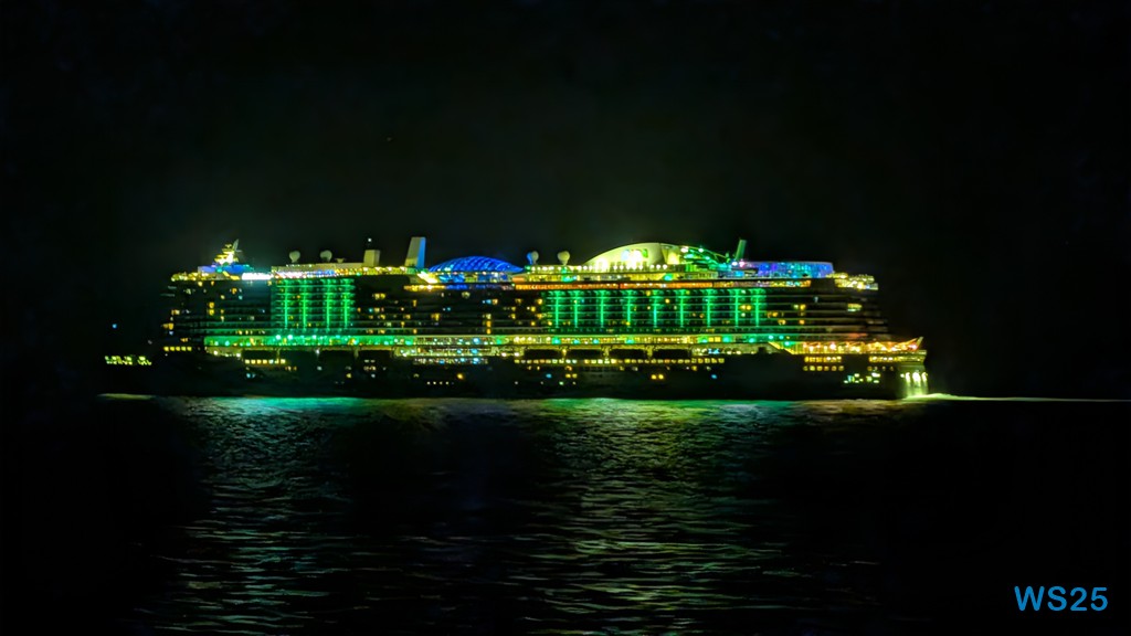 Irgendein Lauftreffen muss hier sein, denn neben einer unendlichen Schlange von Gästen, die das Schiff Richtung Stadt verlassen, laufen längs vor der Schiff größere Gruppen von Joggern, die sich dann anschließend an einem Geschäft treffen. Das passiert uns dann doch nicht, mitten in der Nacht durch die Stadt zu rennen.