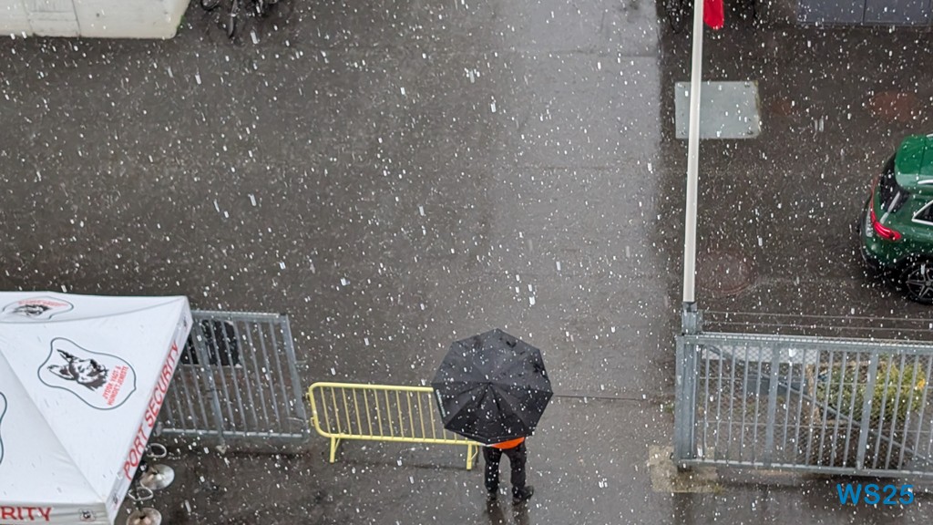 Wir beobachten weiter auf dem Balkon, wie Gäste das Schiff verlassen und wiederkommen, wie es sich immer mehr bezieht und dann heftige Schauer herunterkommen.