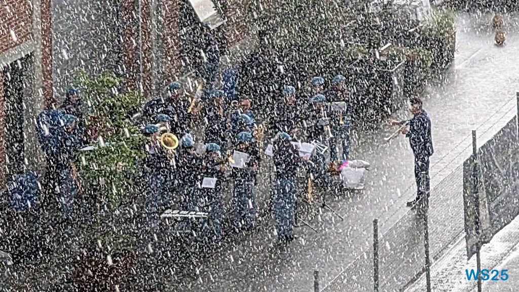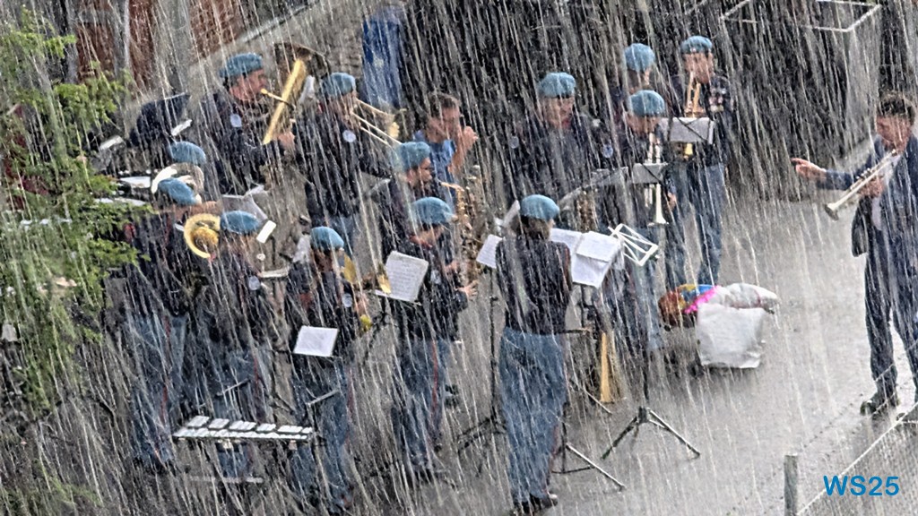 Denn es fängt zwischendurch wieder an zu regnen. Andere Musikgruppen würden jetzt schnell ihre Noten schnappen und sich irgendwo trocken unterstellen. Aber nicht diese Gruppe. Die spielen einfach weiter, im Moment „I am sailing“. Der Regen wird heftiger und immer heftiger. Die Gruppe spielt weiter. Der Regen wird so heftig, dass wir durch die Regenwand die Gruppe kaum noch erkennen können. Aber wir hören sie, denn sie spielt weiter. Zwischendurch müssen halt die Tuba und die anderen nach oben offenen Instrumente immer wieder ausgekippt werden, aber das stört die Musiker nicht. Und als der Regen aufhört, spielen sie immer noch, stehen in großen Pfützen und haben trotzdem sichtlich Spaß.