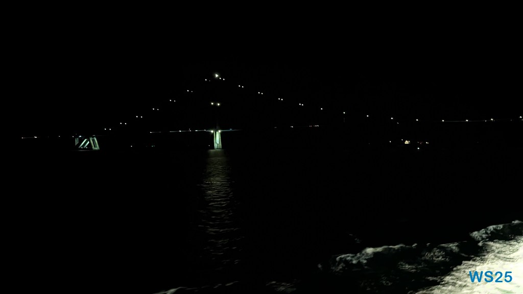 Danach wird es schon wieder Zeit, den Koffer zu packen und vor die Tür zu stellen. Bevor wir schlafen sehen wir aber noch gegen 23 Uhr die AIDAnova an uns vorbeifahren, die uns auf dem Weg nach Norwegen entgegen kommt. Und die Unterquerung der Storebæltsbroen, die Brücke zwischen Fünen und Seeland, eine halbe Stunde später.
