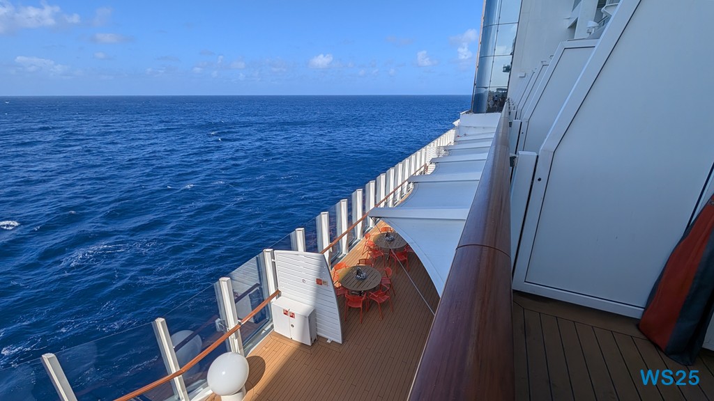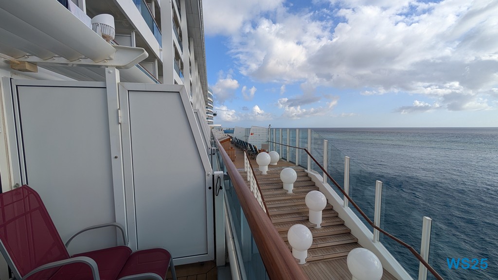 Der Balkon ist größer als bei der normalen Balkonkabinen. Größer noch als bei den Verandakabinen, die ja schon den größeren Balkon haben. Kleiner dann aber als bei den Suiten.