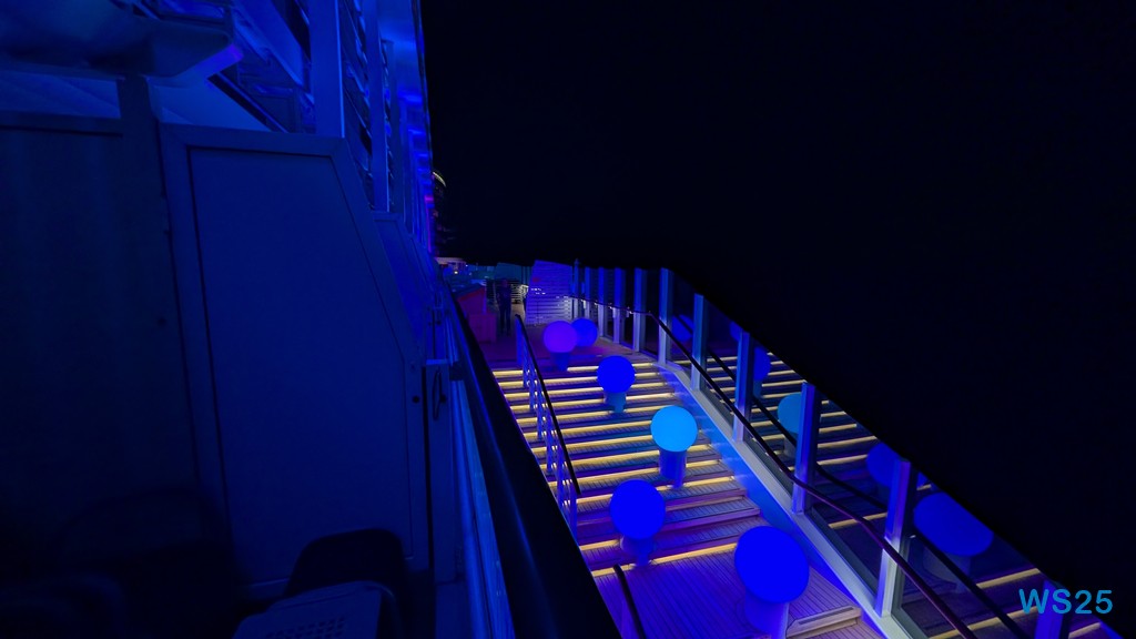 Da die Junior-Suiten auf der AIDAperla umgewandelte Lanai-Kabinen sind, befinden sich diese auf dem Lanai-Deck. Das ist Deck 8. An Deck 8 geht außen eine Promenade fast ganz um das Schiff herum. Nur im hinteren Teil ist diese Promenade mit einer Treppe verschwenkt auf Deck. 7.
