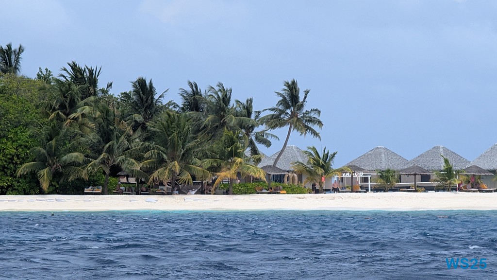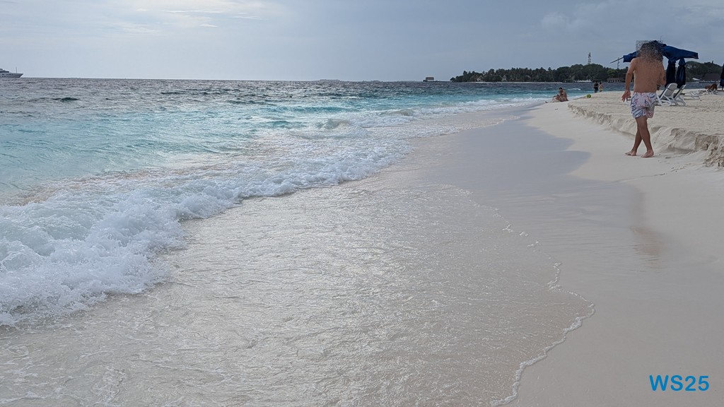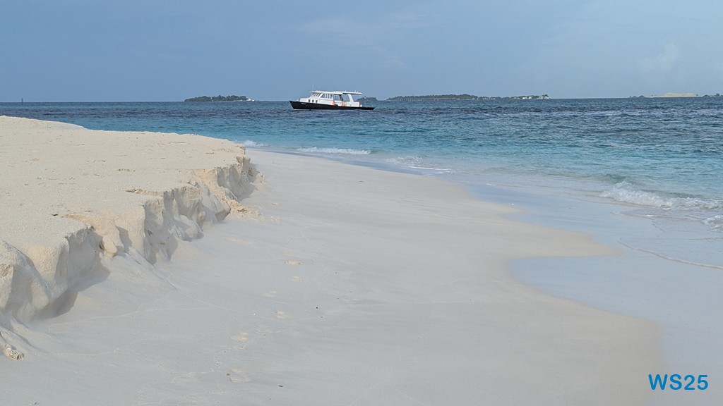 Nun ja, für die kurze Zeit kann man das aushalten, in der Ausflugsbeschreibung steht, dass wir 45 Minuten Überfahrt haben und dann sechs Stunden lang auf einer der wunderschönen maledivischen Inseln an einem Resort den Strand genießen können.