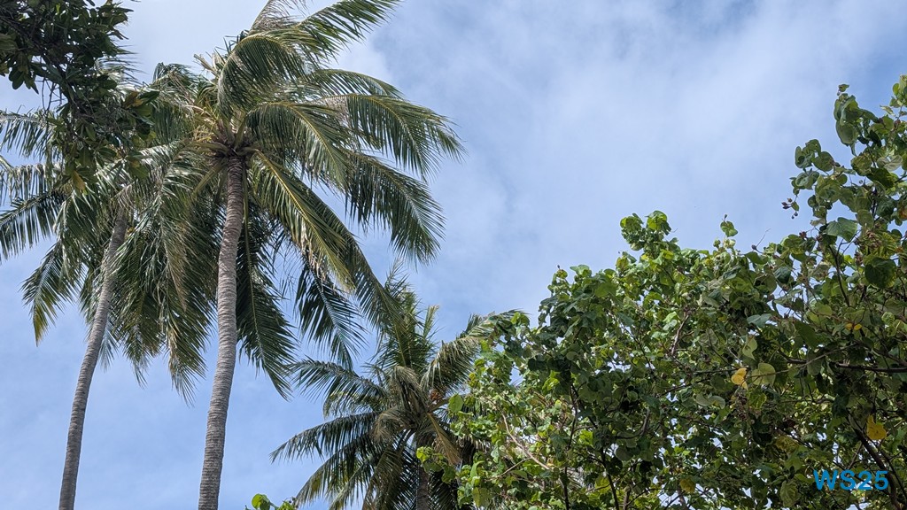 Nachdem wir unsere Handtücher ausgebreitet haben, springen wir natürlich sofort ins Wasser. Das fühlt sich nicht ganz so warm an wie die letzten Tage. Aber es sind trotzdem 30°C bei 29°C Lufttemperatur. Und das ist herrlich. Wir haben eine leichte Welle, die aber nur zum Strand spült und nicht aufs Meer hinauszieht. Und durchsichtig, wie wir das aus der Karibik kennen. Der Sand ist ganz weiß, hat keine Steine, aber Bruchstücke vom Riff, wie das oft auf Inseln ist, die durch Riffe entstanden sind.