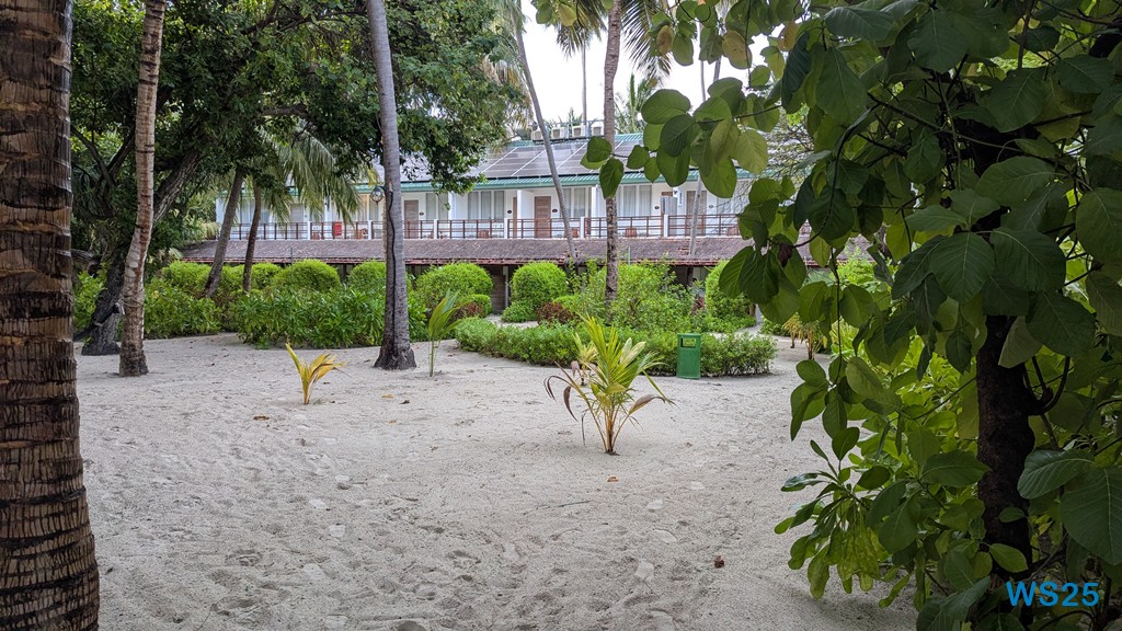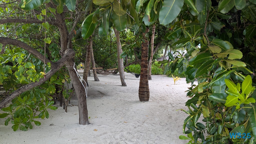 Die Insel Kuda Bandos und das Malahini Resort darauf können für diese ganze Situation nichts dazu. Deshalb muss ich dies auch fair beschreiben: die Insel ist toll. Es ist eine kleine Insel, die in der Mitte dicht mit Palmen und anderen Bäumen bewachsen ist. Rundherum ist schneeweißer Sand, der flach in ein herrlich türkises Meer übergeht. Dort wo das Meer dann tiefer wird, ist ein Riff.