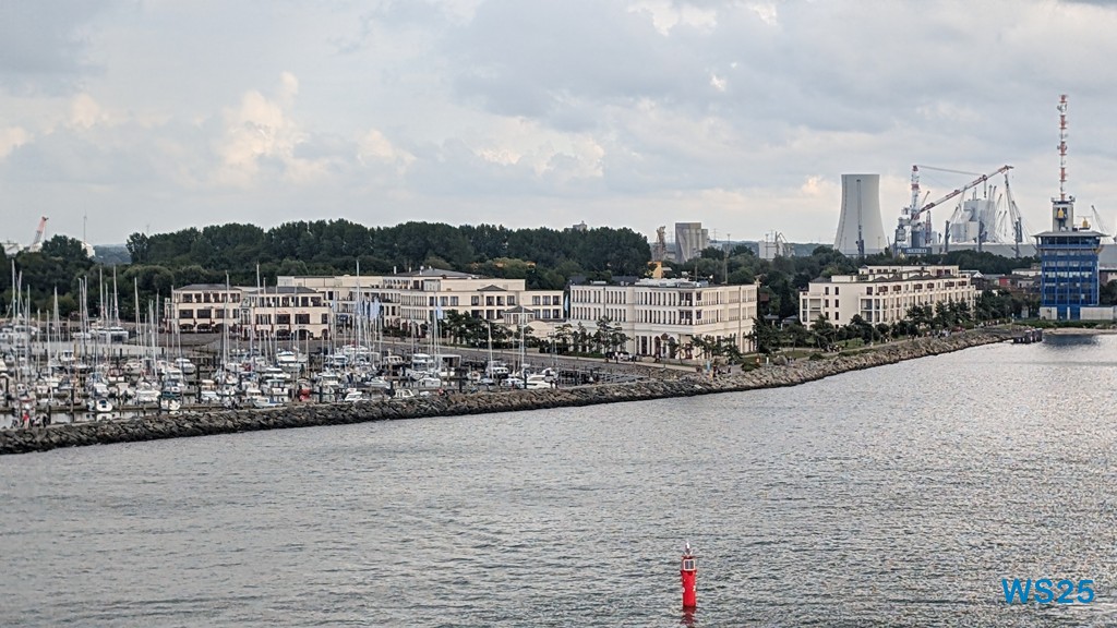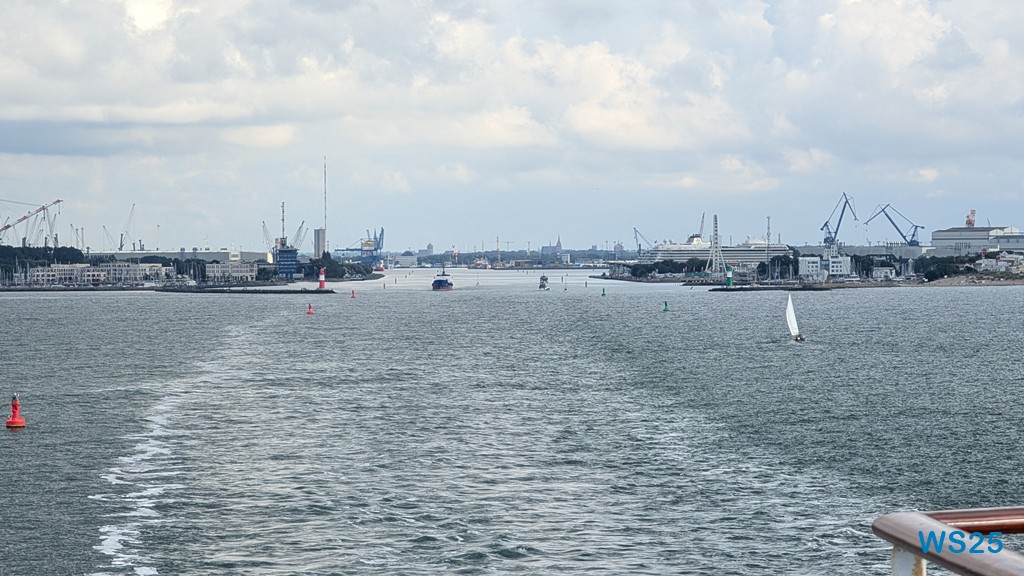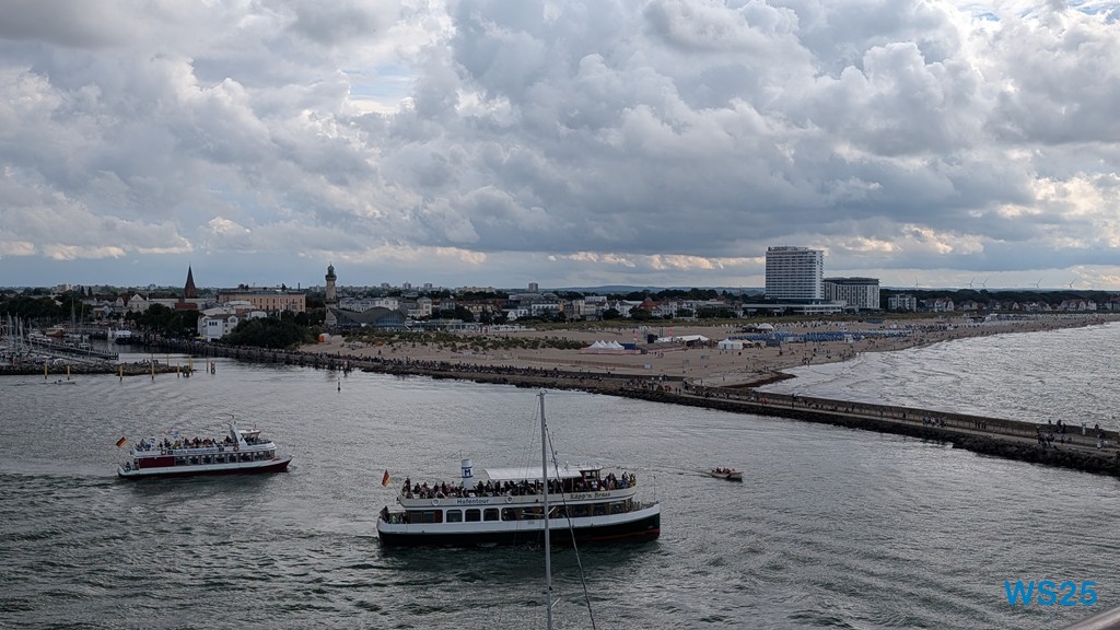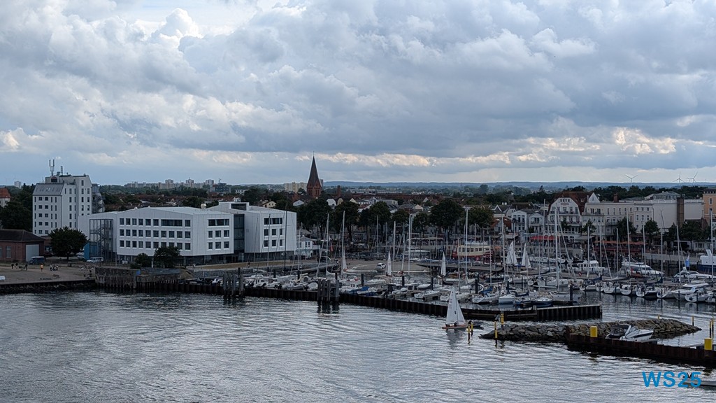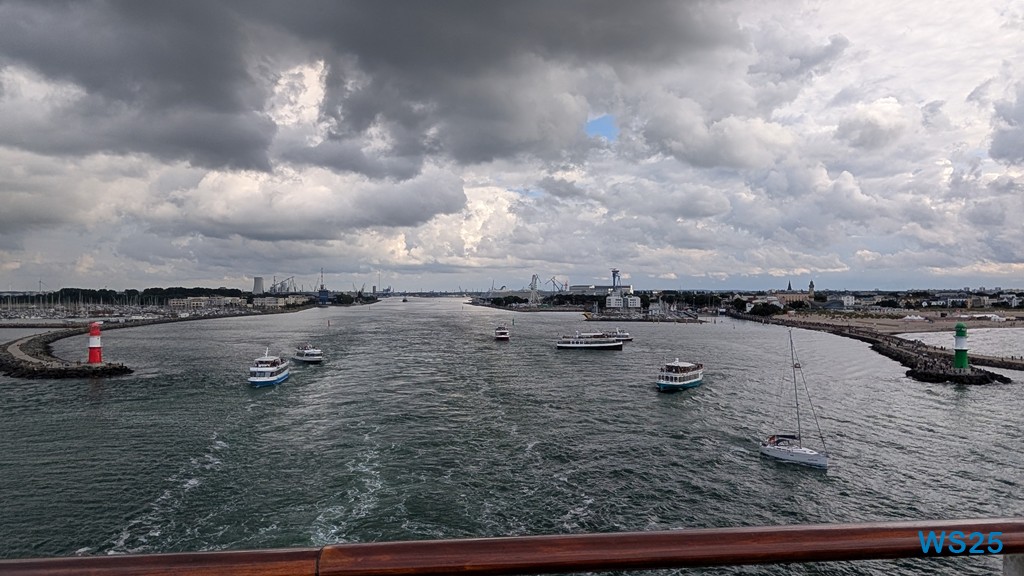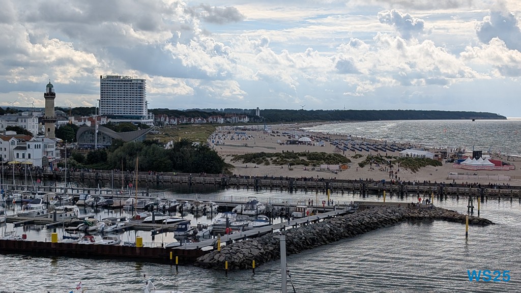Warnemünde ist ein besonders schöner Starthafen, weil beim Auslaufen der Blick zur einen Seite über die Altstadt geht, über Leuchtturm und Muschel, über den Strand. Über den Wohnmobil-Stellplatz direkt am Ufer, auf dem wir kürzlich noch standen und die vorbeifahrenden Schiffe fotografiert haben.