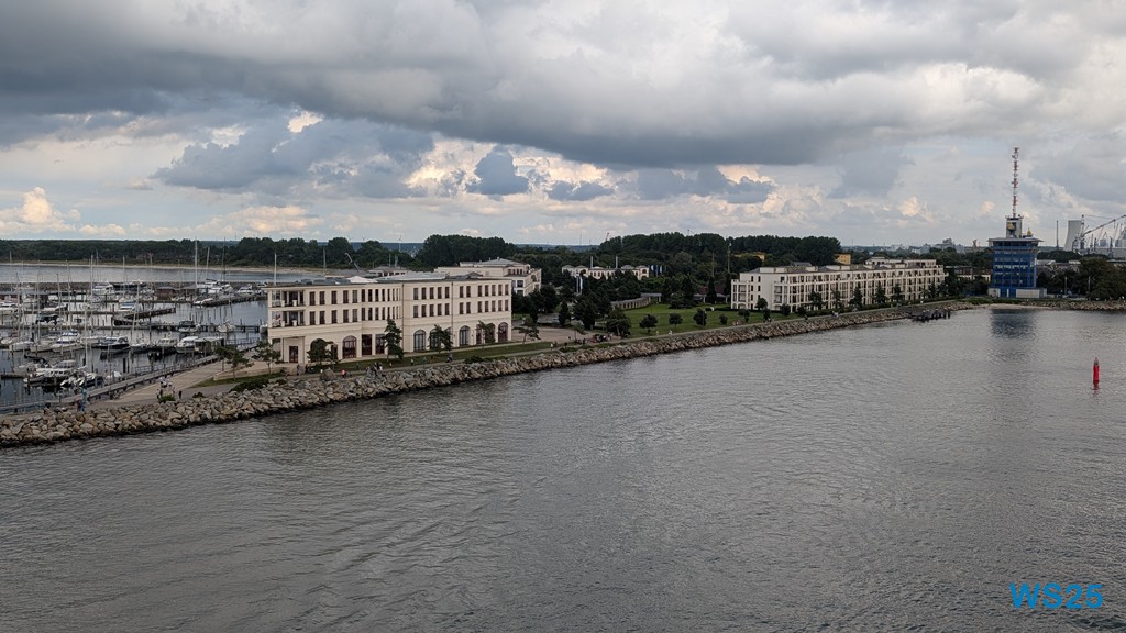 Der Fahrer ist gleich mal ein Ostsee-Original und unterhält uns gut. Und erklärt am Terminal, wo Koffer abzugeben sind und wo das Einchecken stattfindet.