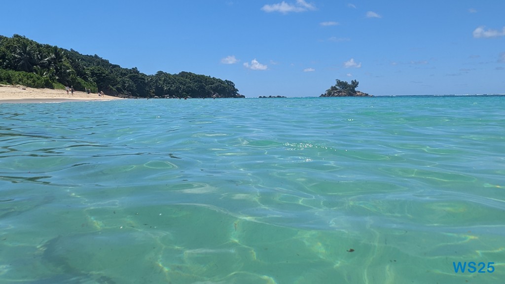 Wir sind hier in einer langbezogenen Bucht. Begrenzt wird sie auf der einen Seite von einer Kirche, die direkt am Wasser steht, auf der anderen Seite von hohen Granitfelsen, die hier auf den Seychellen typisch sind. Das haben wir auch bei den letzten Ausflügen gesehen, dass die wunderschönen Sandstrände unterbrochen werden von braunen, übermannshohen, glatten Granitfelsen. Auch das sieht wirklich schön aus.