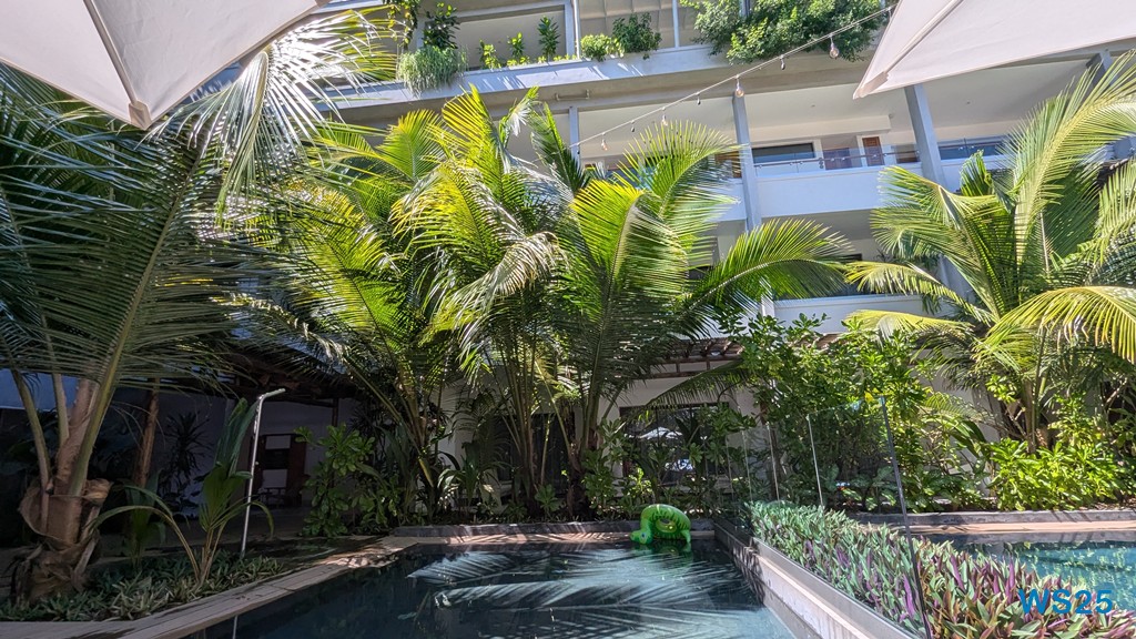 Erst einmal sieht das hier alles total schön aus: der Pool befindet sich in einem Innenhof und ist so groß, dass man richtig Bahnen ziehen kann. Auf der einen Seite des Pools befinden sich Liegen und eine Bar, die man auch vom Pool aus anschwimmen kann. Auf der anderen Seite des Pools wachsen Palmen, die so groß sind, dass sie einen Teil des Pools beschatten. Je nach Sonnenstand lässt sich so immer etwas Schatten auch im Pool finden.