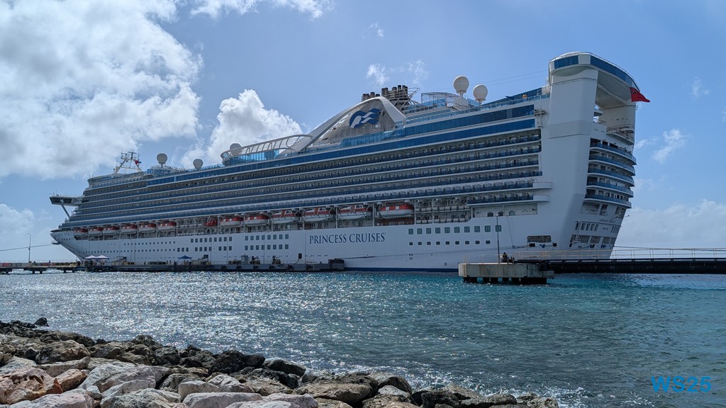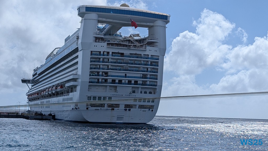 Auf dem Patio-Deck sehen wir dann auch das Auslaufen des Schiffs, das heute vor uns lag, die Caribbean Princess. Hatte ich gestern behauptet, das Virgin-Schiff wäre hässlich gewesen, kann ich heute nichts anderes sagen.