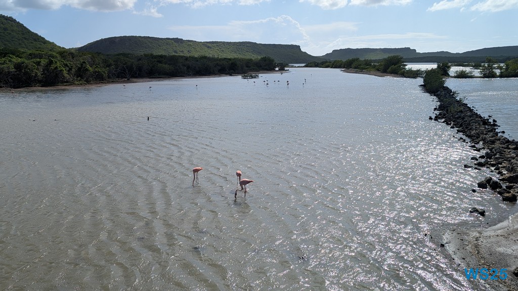 Wir nehmen einen kleinen Umweg über Seru Largu Nationalpark. Dort ist eine Lagune, in der Flamingos leben. Direkt neben der Straße steht das Wasser, und hier ist eine kleine Aussichtsplattform aus Holz gebaut, von der man die Flamingos beobachten kann, die im Wasser stehen und mit den Schnäbeln nach Nahrung suchen. Das ist ganz schön, die rosa Vögel dabei zu beobachten, wie sie den Kopf ins Wasser stecken oder durch das flache Wasser waten. Das lohnt sich sicherlich nicht für einen Tagesausflug, aber so im Vorbeifahren hier einen Stopp einzulegen, ist ganz schön.