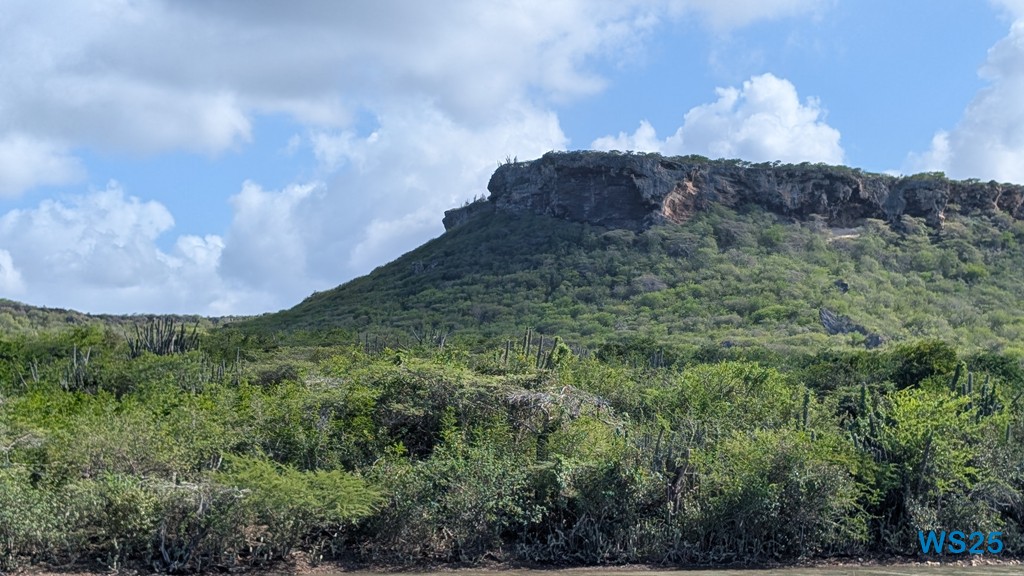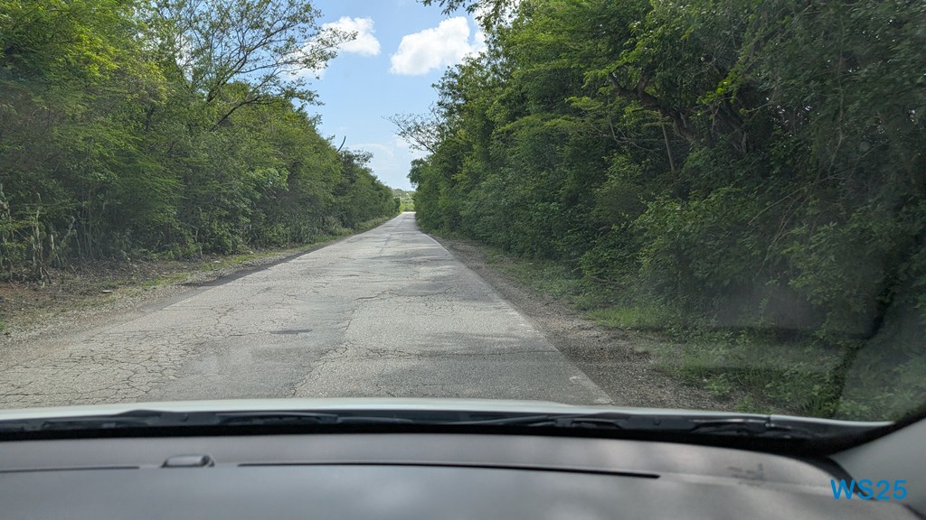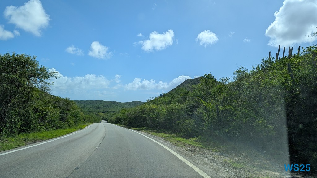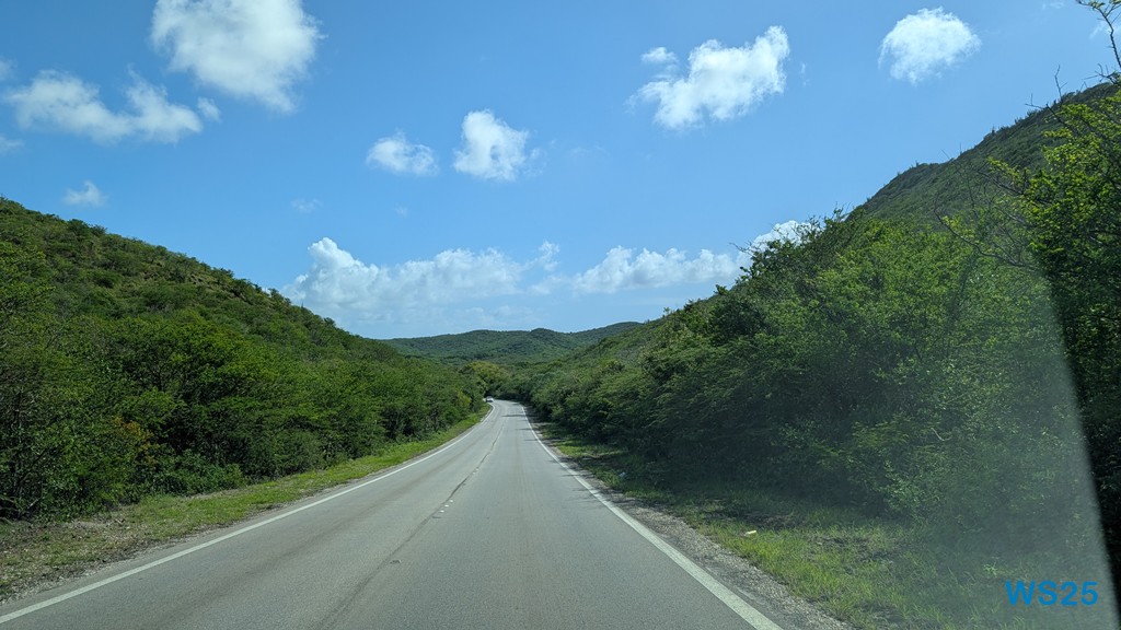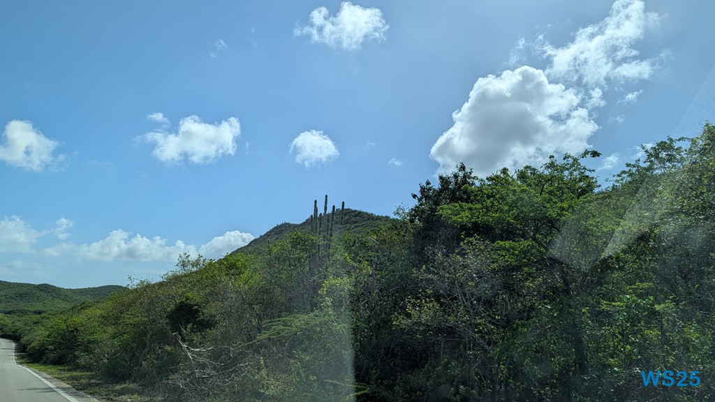 Zunächst geht die Fahrt aus der Stadt heraus. Die gleiche Strecke, die wir gestern gefahren sind, dann fahren wir aber immer weiter über die Insel. Die Straßen werden schmaler, sind aber weiterhin gut ausgebaut. Wie auf der ganzen Strecke gestern ist auch hier viel Grün: auf beiden Straßenseiten sind dichte Büsche, zwischen denen kein Durchkommen ist. Immer wieder ragen aus diesen Büschen Säulenkakteen heraus. Zu sagen, dass es bergig ist, wäre sicherlich übertrieben, zumindest für Menschen, die aus den Alpen stammen. Deshalb sagen wir eher, es ist wellig. Wenn wir auf so einer Welle sind, dann können wir weit über das Land gucken und dann sehen wir, dass es überall so grün und mit dichten Büschen bewachsen ist, auch hoch in die kleinen Berge.