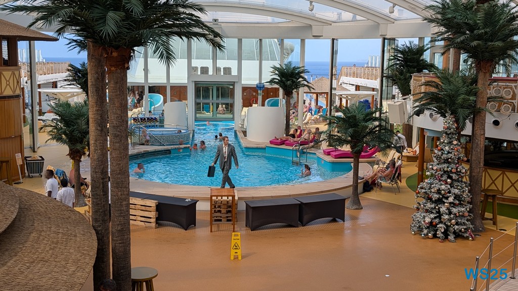 Der Beach Club hat ja ein UV-durchlässiges Dach, so dass unsere Sonnencreme Sinn macht. Außerdem müssen wir die komplett neue Wasserfüllung des Pools ausprobieren.