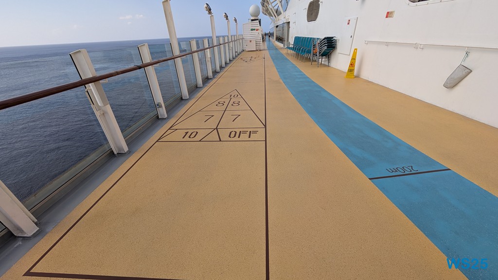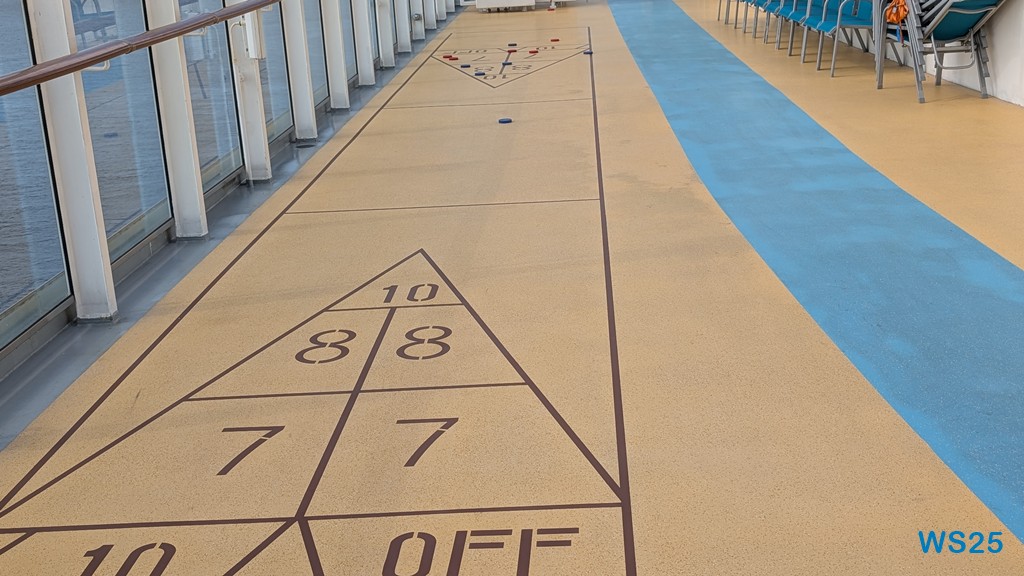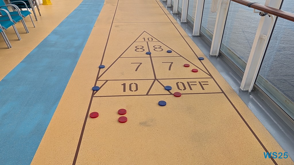 Nachdem wir alle genug gebadet haben und die Kinder noch einmal rüber zu den Rutschen gegangen sind, beschließen wir, noch eine Runde Shuffleboard zu spielen. Das haben wir ja schon auf manchen Fahrten gemacht und es hat uns immer viel Spaß gemacht