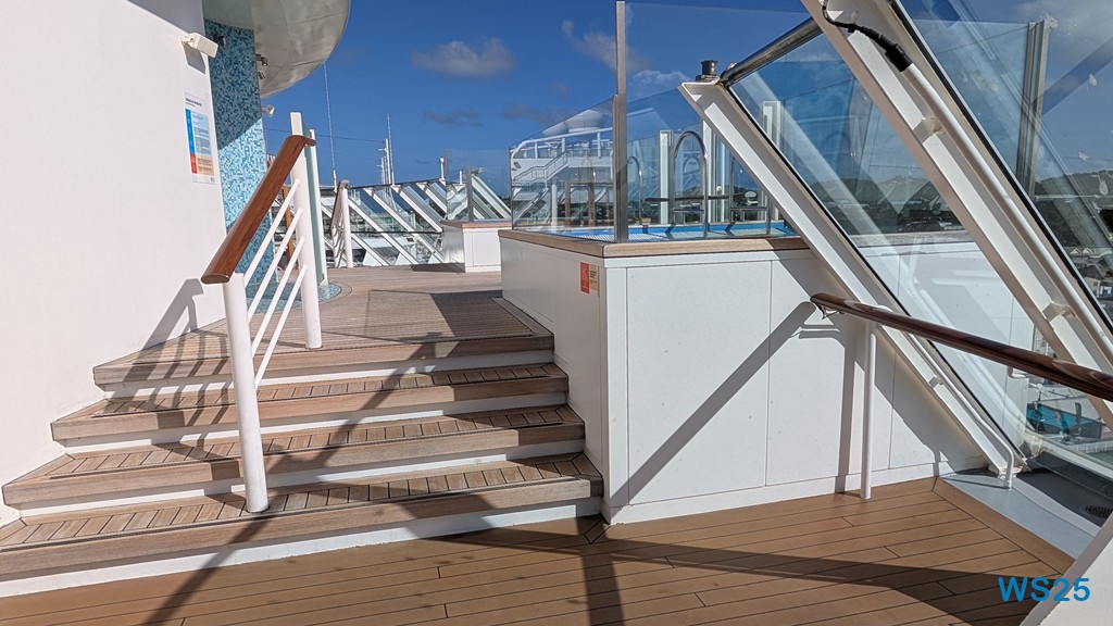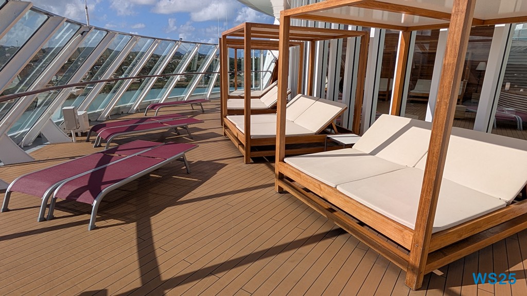 Danach gehen wir wieder zurück zum Patio Deck und breiten uns auf den Liegen aus. Es ist schon sehr warm hier. Draußen sind 29°C, aber wir liegen hier im Halbschatten.