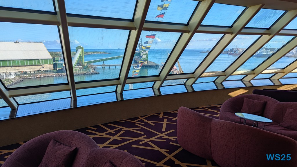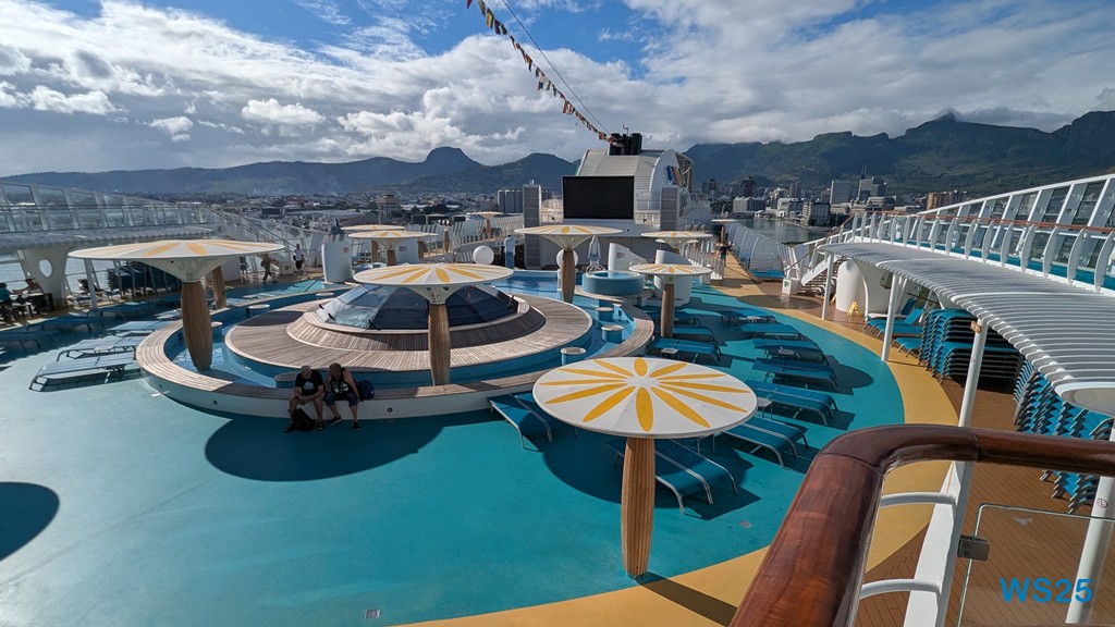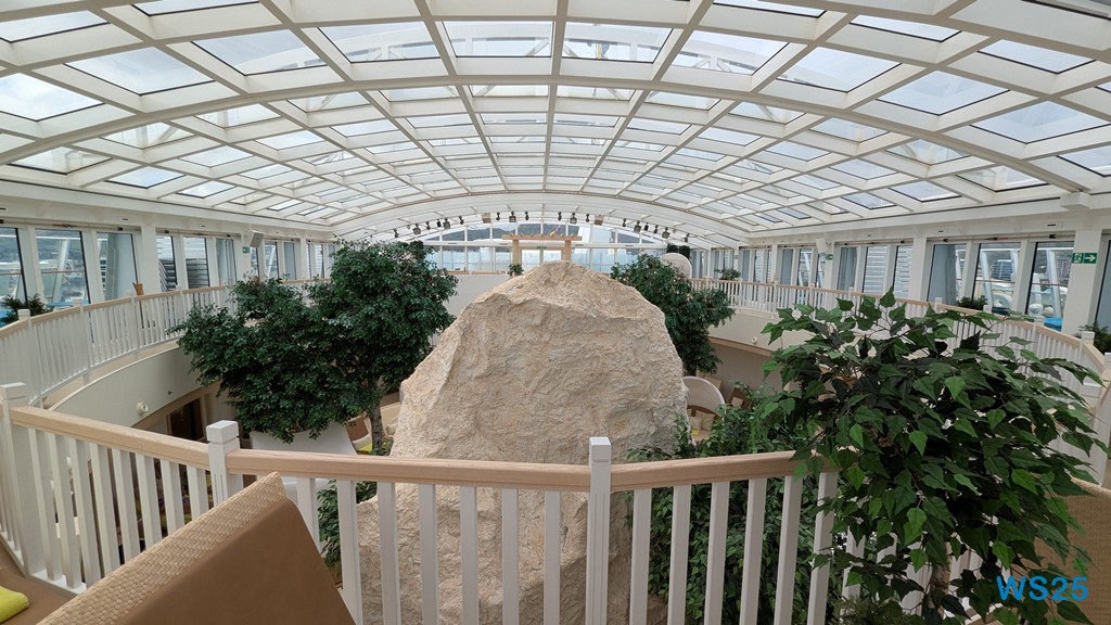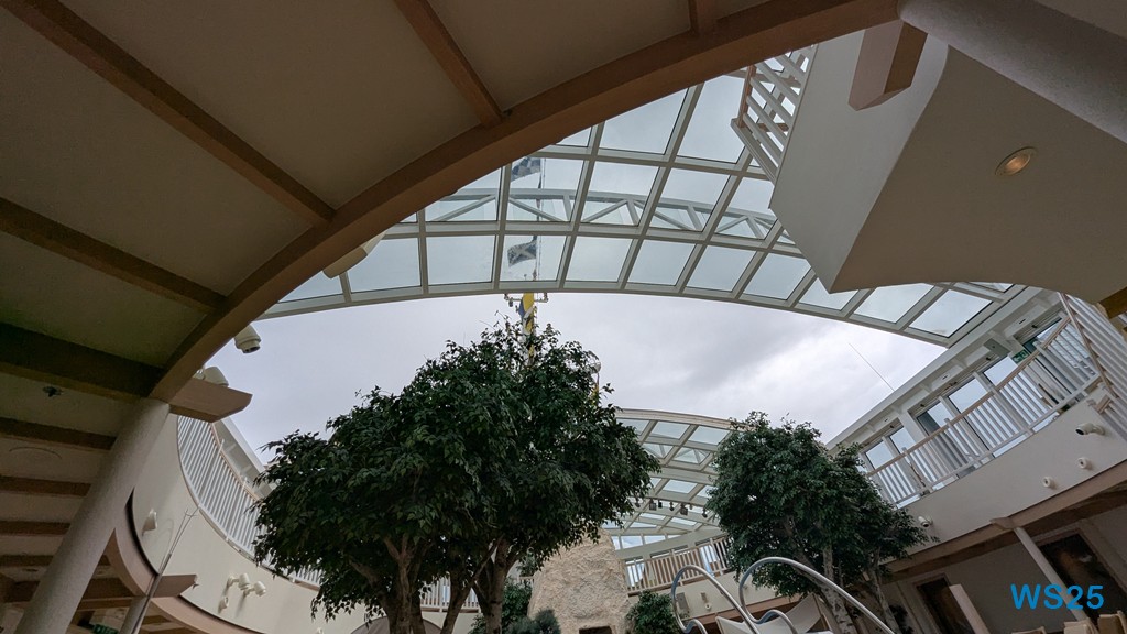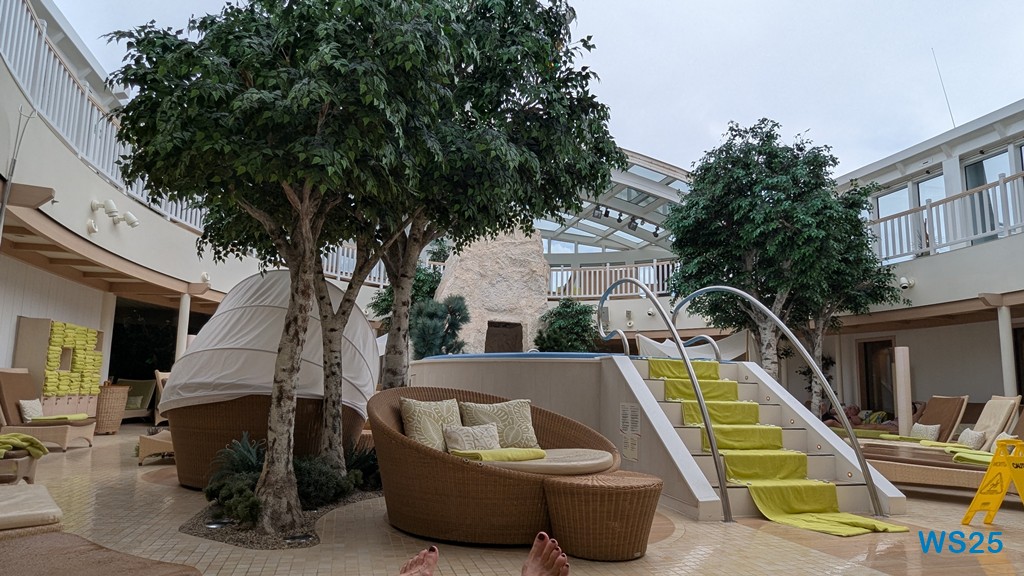 Wir gehen in die Oase. Um einen Whirlpool in der Mitte sind rundherum Liegen aufgebaut. Deutlich bequemere Liegen als auf den Decks. Weiter nach vorne sind weitere Liegen und ein Außenbereich direkt am Bug. Über eine weitere Treppe geht es ein Deck höher. Dort sind auch noch mal Liegen direkt unter dem Glasdach, das sich über den gesamten Bereich erstreckt.