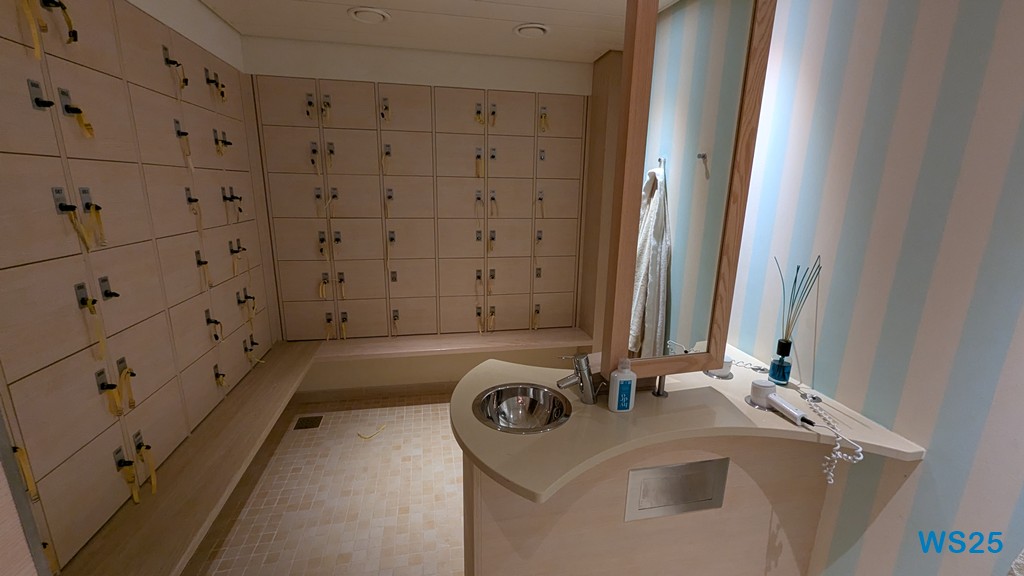 Es geht dann über eine Treppe ein Deck nach oben. Hier ist dann die Wahl, zu Toiletten, zu einer Umkleide, zur Sauna, zu Anwendungen oder in die eigentliche Oase zu gehen. Die Sauna ist inklusive, Anwendungen müssten extra bezahlt werden.