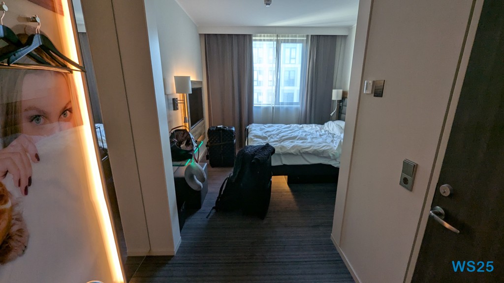 Danach versuchen wir, auf die Kabine zu kommen, aber es ist jetzt noch deutlich zu früh. Sie steht offen und der Steward ist zugange. Offiziell werden die Kabinen erst um 16 Uhr frei gegeben. Oft sind diese schon früher fertig, aber in diesem Fall nicht, es ist erst 11 Uhr.
