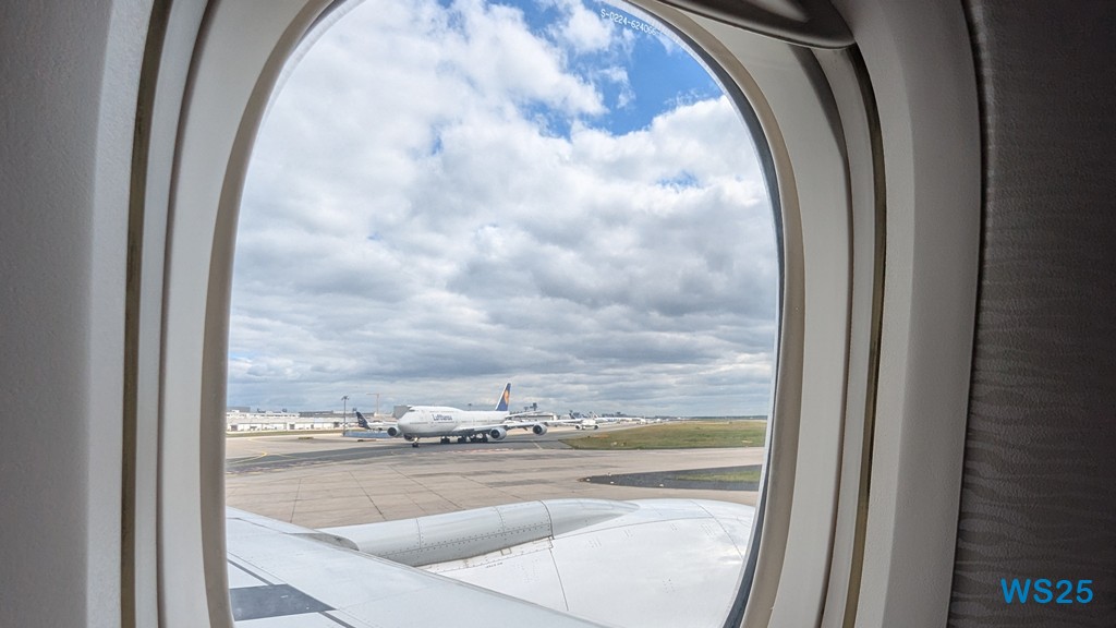 Eine halbe Stunde rollen wir über das Vorfeld, müssen noch eine Lufthansa-Maschine an uns vorbeirollen lassen, bis wir endlich abheben.