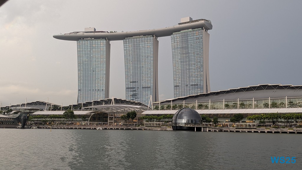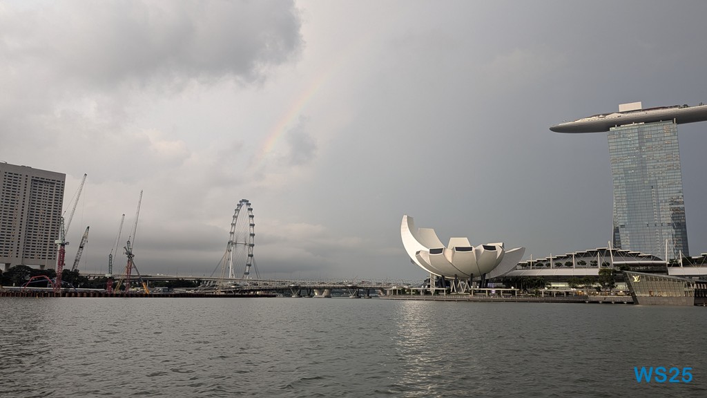 Unsere neue Kreuzfahrt beginnt 2 Tage früher. Mit Gewittersturm, „Deppen“ in der Schlange, einem Hotel und zwei Flügen. Geduld erweist sich als Kernkompetenz – mehr oder weniger. Und trotz schwüler Hitze und Tücken der Flughäfen kommen wir zum ersten Mal müde in Südostasien an. Aber geschwächelt wird nicht, deshalb gibt es bereits am Abend der Ankunft den ersten Ausflug. Mit dem Boot geht es über den Singapore River, zu einem Nachtmarkt, zur Lasershow und einem Abschluss-Cocktail.