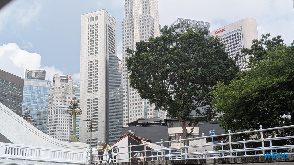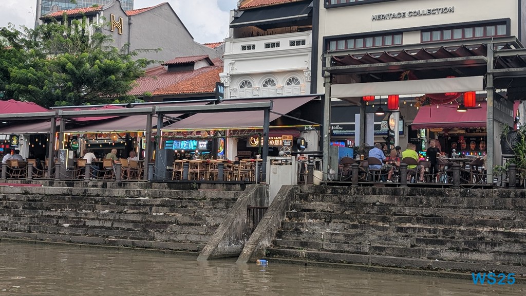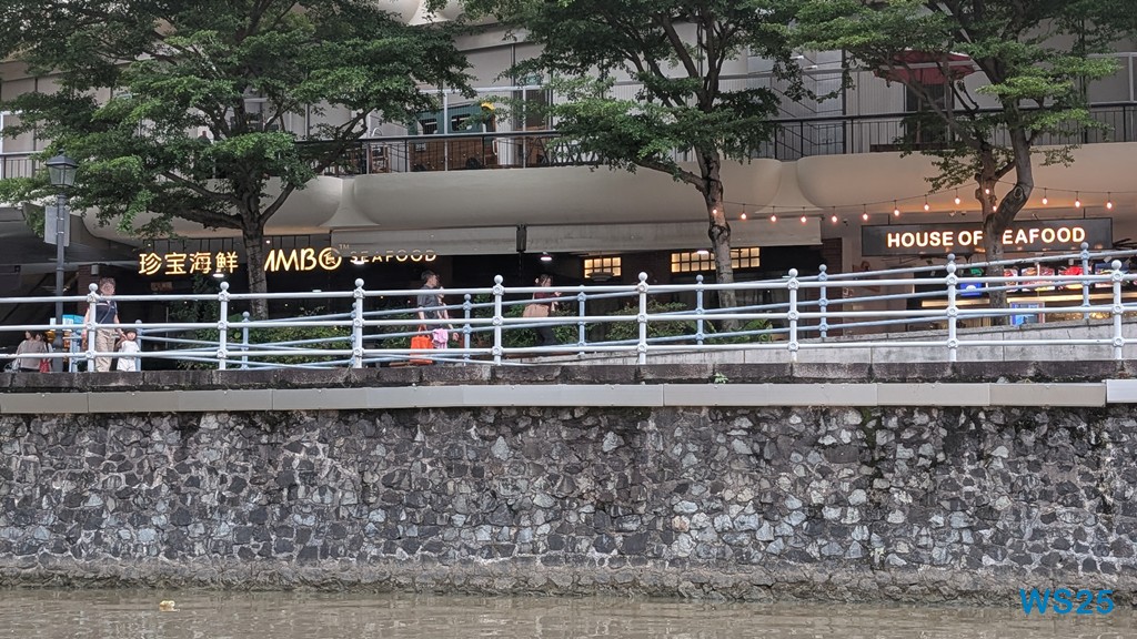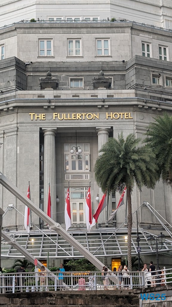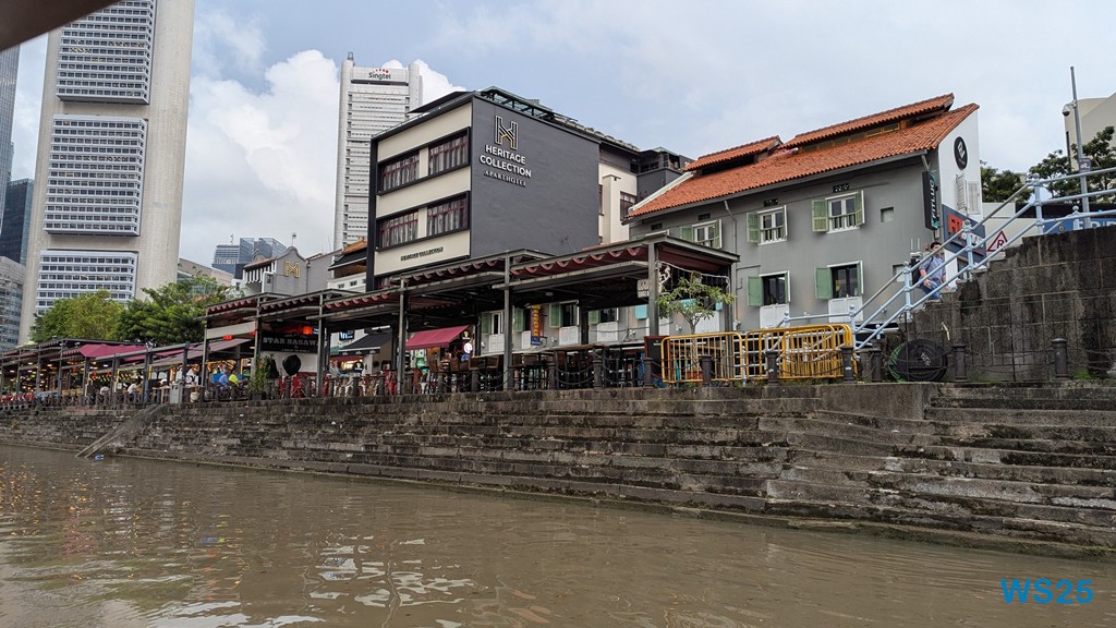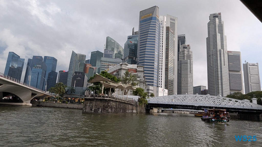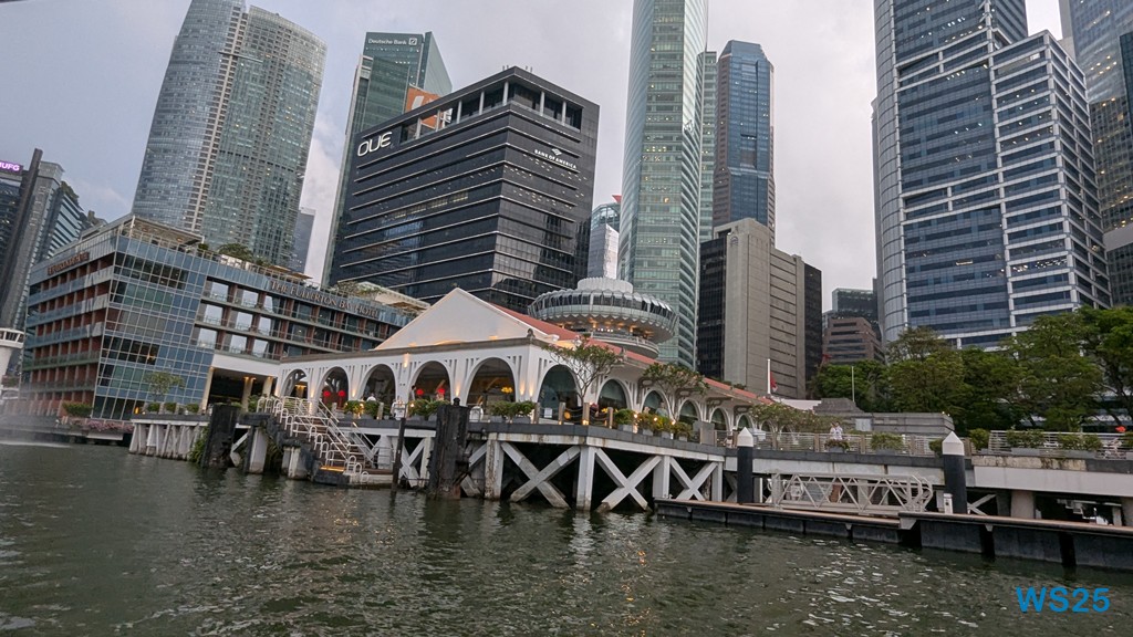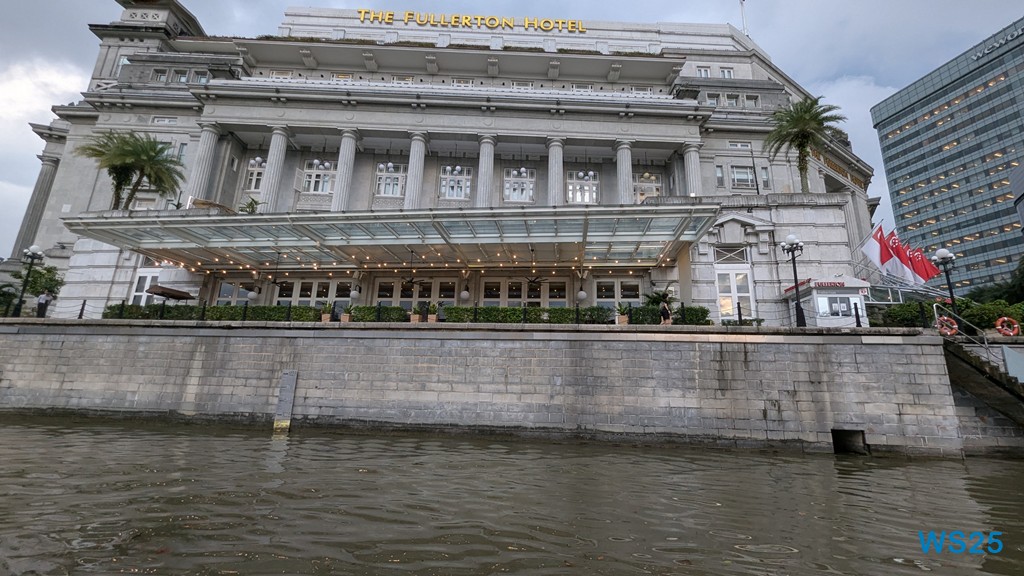 Die gesamte Fahrt dauert etwa eine halbe Stunde, größer sind River und Bucht nicht. Währenddessen läuft ein Band auf Deutsch ab, das gut erklärt, was wir am Ufer sehen. Zunächst der ehemalige Hafen, in dem früher die Schiffe entladen wurden: Kulis haben auf den Schultern über wackelige Planken die Waren an Land getragen. Dahinter dann chinesische Handelshäuser, die heute größtenteils zu Restaurants ausgebaut sind. Kurz danach kommen hinter diesen traditionellen Häusern moderne Hochhäuser, die schon zum Finanzdistrikt gehören. Wir fahren vorbei an riesigen edlen Hotels wie dem Fullerton Hotel.
