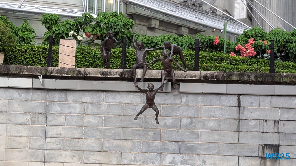 In der Bucht dann ein Wahrzeichen der Stadt, der Merlion, eine Figur, die im oberen Teil aus Löwenkopf und im unteren Teil aus Fisch besteht. Aus dieser kommt ein großer Wasserstrahl.